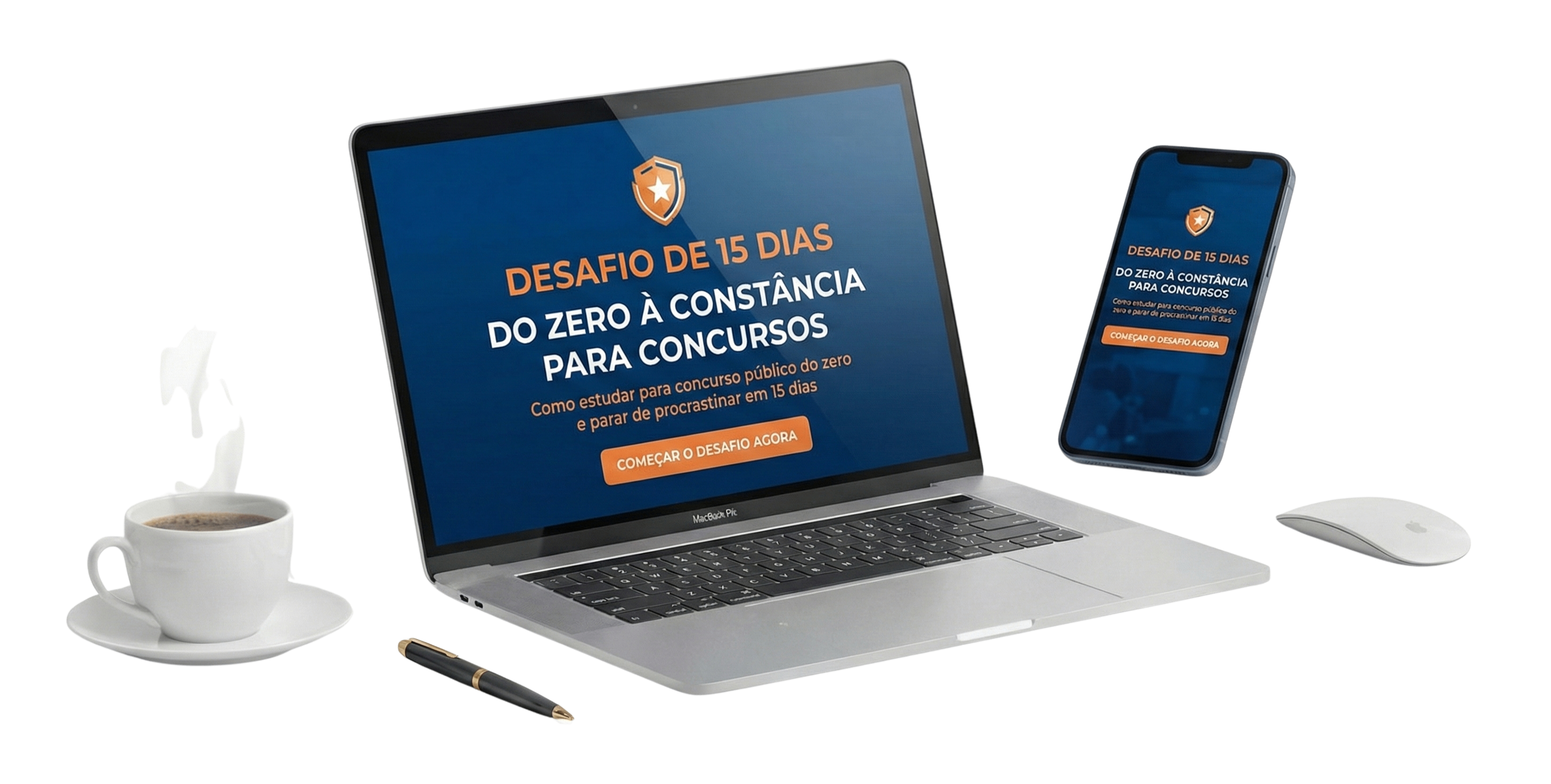 Método prático de 15 dias para sair do zero e eliminar a procrastinação nos estudos. Baseado em ciência comportamental, não em força de vontade. Criado por Junior e Diego do Mente de Concurseiro, ensina como construir o hábito de estudar diariamente — começando com apenas 15 minutos. Inclui fundamentos do hábito, sessões práticas nas matérias que mais caem e protocolo anti-procrastinação. Para quem está começando do zero, tem pouco tempo ou está cansado de procrastinar.